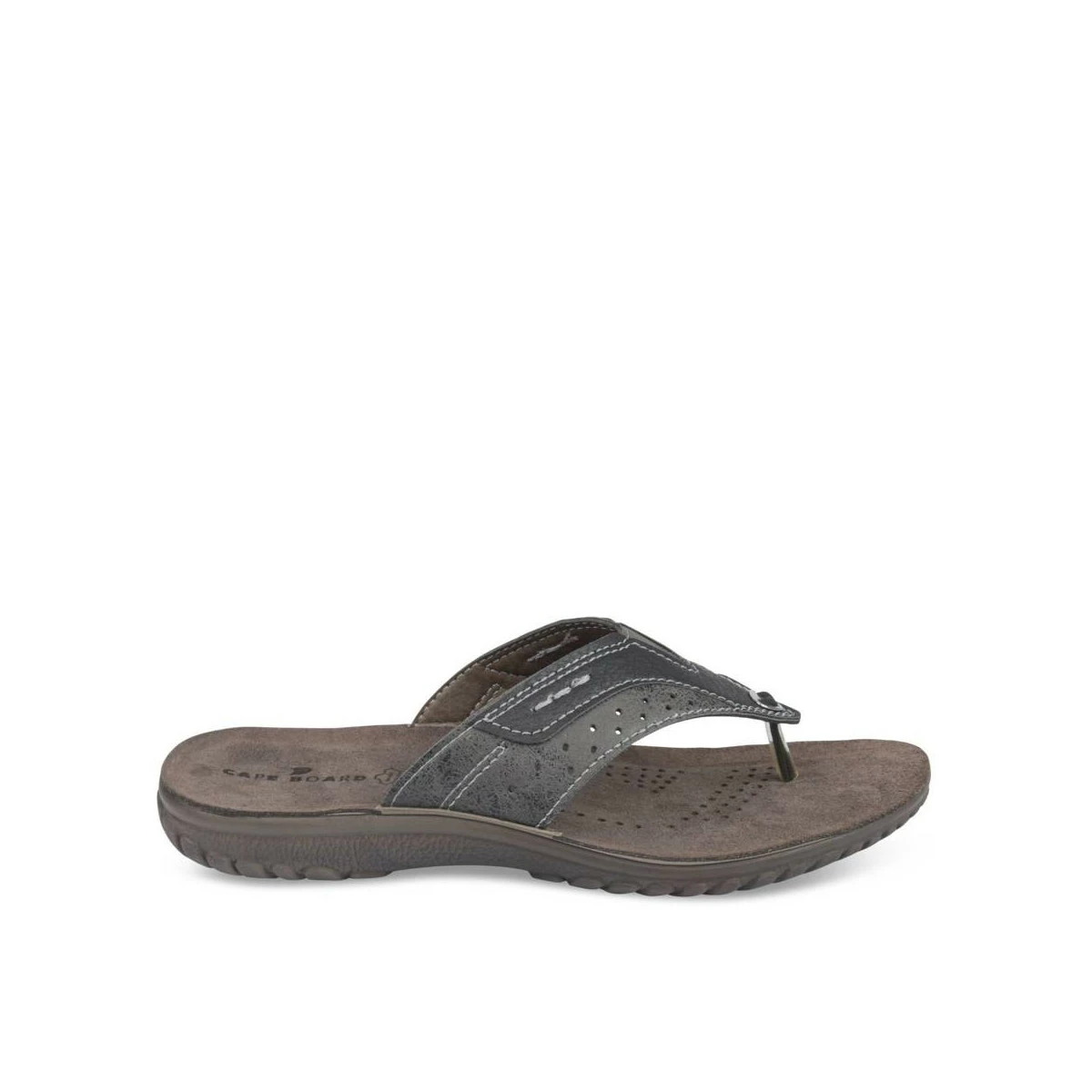 En été, aérez vos pieds en portant cette tong noire en simili cuir ! Sa semelle intérieure en cuir véritable procure une respirabilité idéale. La bride triangle à entredoigt est travaillée : surpiqûres, empiècements, perforations et jeux de couleurs. Facile et pratique à enfiler, cette tong est votre meilleure alliée de la saison estivale !